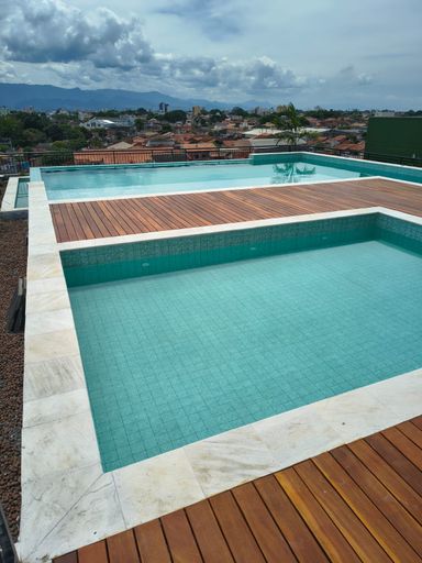 O condomínio possui área gourmet com churrasqueira, piscinas com borda infinita, academia, salão de jogos, quadra poliesportiva e portaria remota.