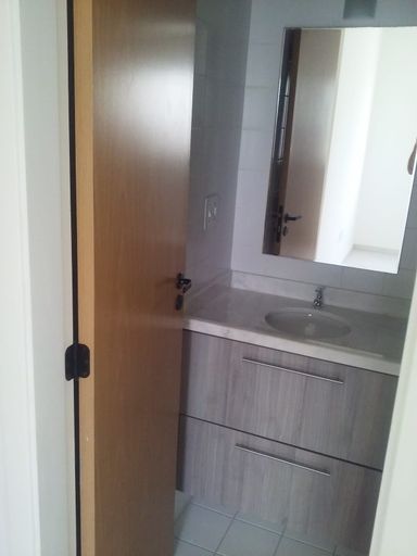 Andar alto, ambientes integrados, equipado com armários na cozinha e banheiros, luminárias, bancadas em granito, revestimento até o teto nas áreas molhadas, box e espelho no banheiro.