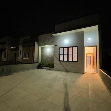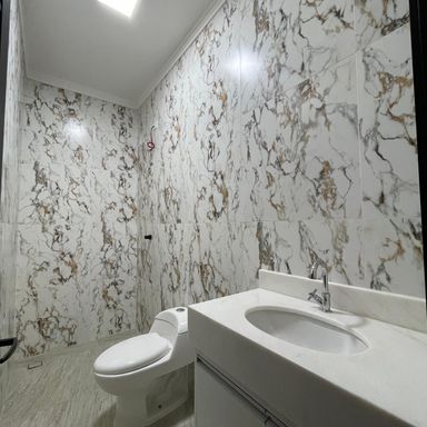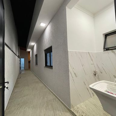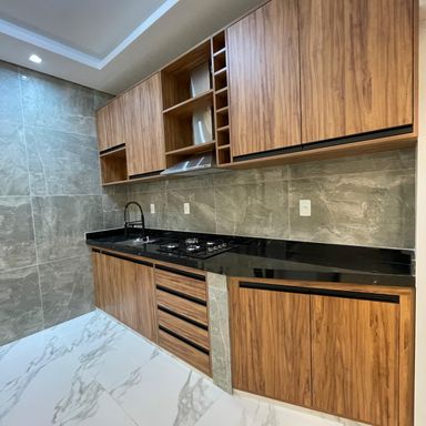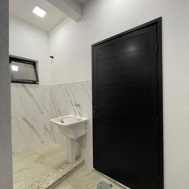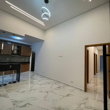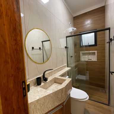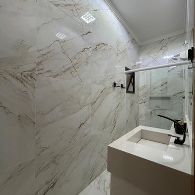 Casa ampla com piscina, banheiro externo, toda em porcelanato, revestimentos até o teto nas áreas molhadas, box nos banheiros, granito na cozinha com planejados e área gourmet, mármore nas pias dos banheiros, guarda corpo de vidro na varanda, luminárias e projeto luminotécnico.
