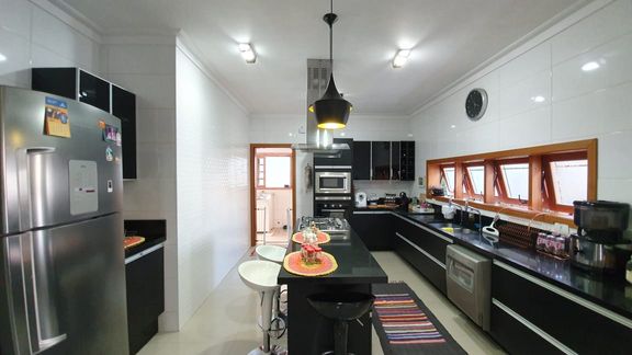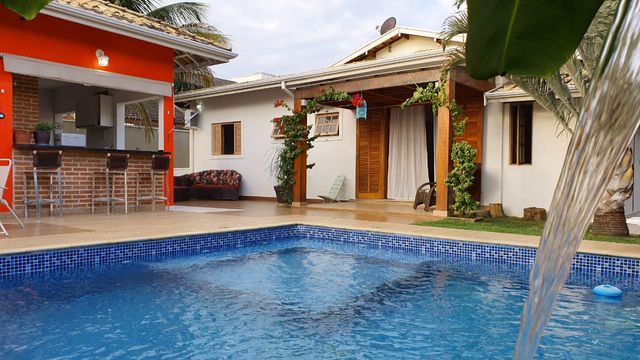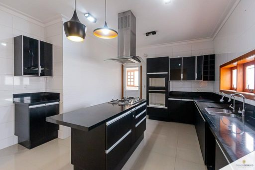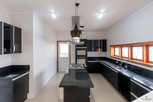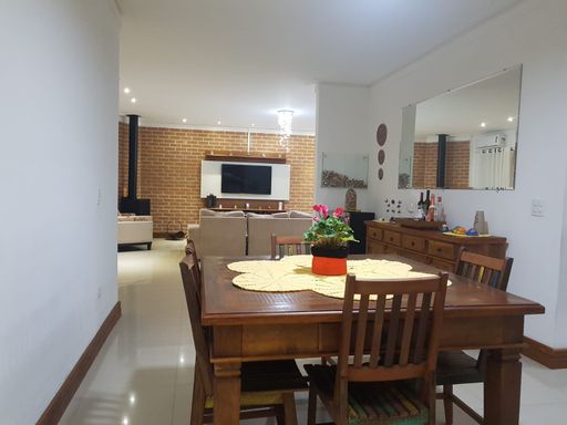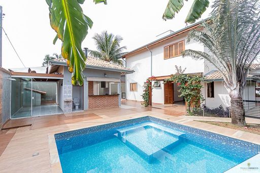 A casa contém cozinha planejada, copa, 4 dormitórios sendo 3 suítes, 5 banheiros, escritório, área de lazer, piscina, churrasqueira, área de serviço e 4 vagas de garagem.